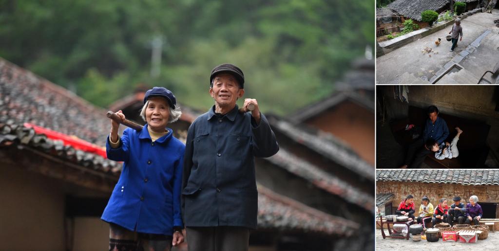 拼版照片:左图为广西融安县东起乡铜板屯的龙显星(右)和老伴巫福昭(2023年4月24日摄);右上图为巫福昭在喂鸡(2013年7月23日摄);右中图为龙显星和外孙女在一起(2013年7月24日摄);右下图为龙显星(右二)、巫福昭带着已经长大了的孙辈们卖土特产(2021年2月15日摄)。