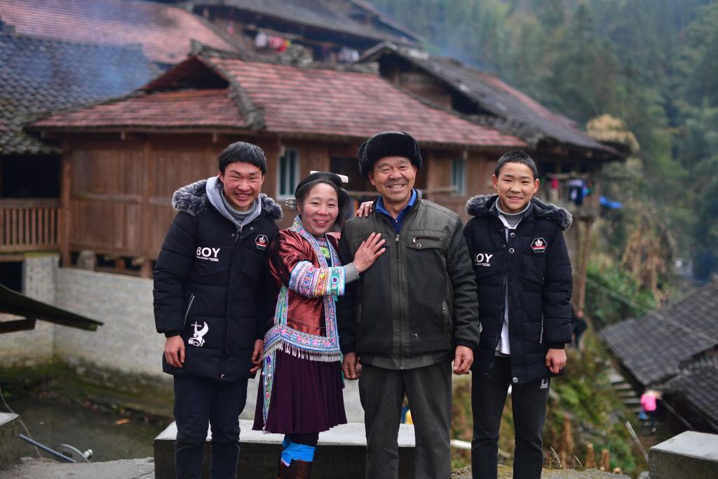 在乌英苗寨,梁足英(左二)和丈夫、儿子合影(2019年2月13日摄)。
