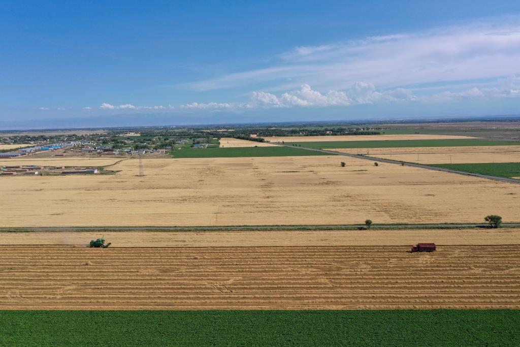 7月9日,在新疆昌吉回族自治州奇台县西地镇的一处制种基地,农户在田间收获小麦。新华社记者丁磊 摄