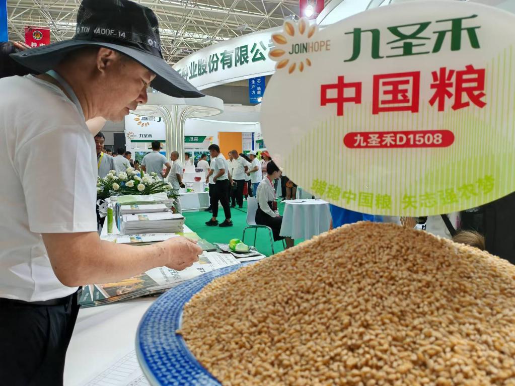 8月6日,2024中国新疆第十届种子展示交易会现场的一家种企展台。新华社记者苟立锋 摄