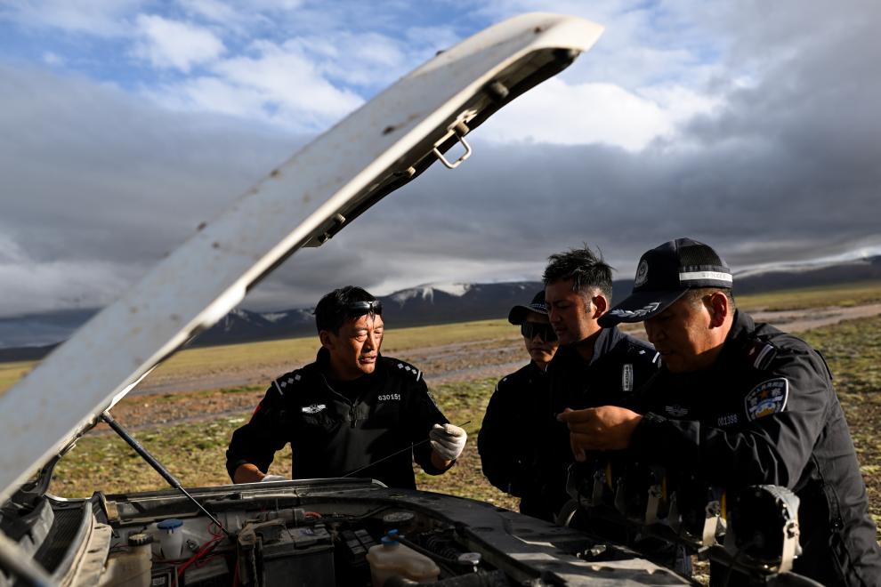 7月7日,可可西里森林公安局巡山队队员尼玛扎西(左)在可可西里腹地修理车辆。新华社记者 张龙 摄