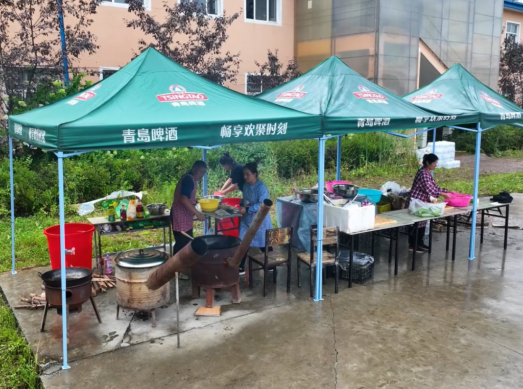 7日下午4时,虎头镇中学临时安置点内早早地支起了大锅,买菜、洗菜、切菜、做饭。当地村民和志愿者们紧张忙碌地为转移群众准备晚饭。随着锅下的火越烧越旺,鸡肉炖土豆、茄子炖肉、木须柿子等热乎的家常菜出了锅,分成一份份送到转移群众手里。“我透过窗户看到志愿者和当地乡亲们顶着太阳,烤着火做饭,让我们吃现成的,心里真不是滋味。”虎头镇大王家村村民王淑艳坐在简易床上端起饭盒。