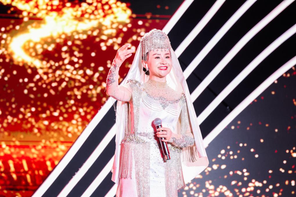 8月7日,撒丽娜在2024全国民歌展演活动上演唱“花儿”。新华社发(常旭峰 摄)