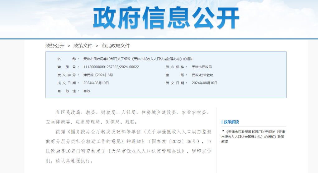 天津市民政局等10部门印发的《天津市低收入人口认定管理办法》