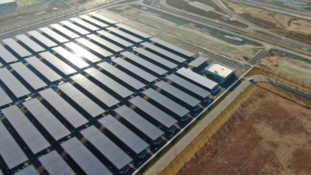 这是在辽宁省沈阳市的华晨宝马铁西新工厂拍摄的光伏发电设施(无人机照片)。新华社记者 杨青 摄
