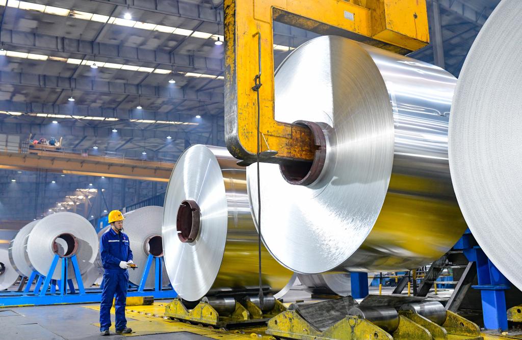 内蒙古霍林郭勒市一家铝业公司,工人在铝箔生产线上作业。新华社发(王正 摄)