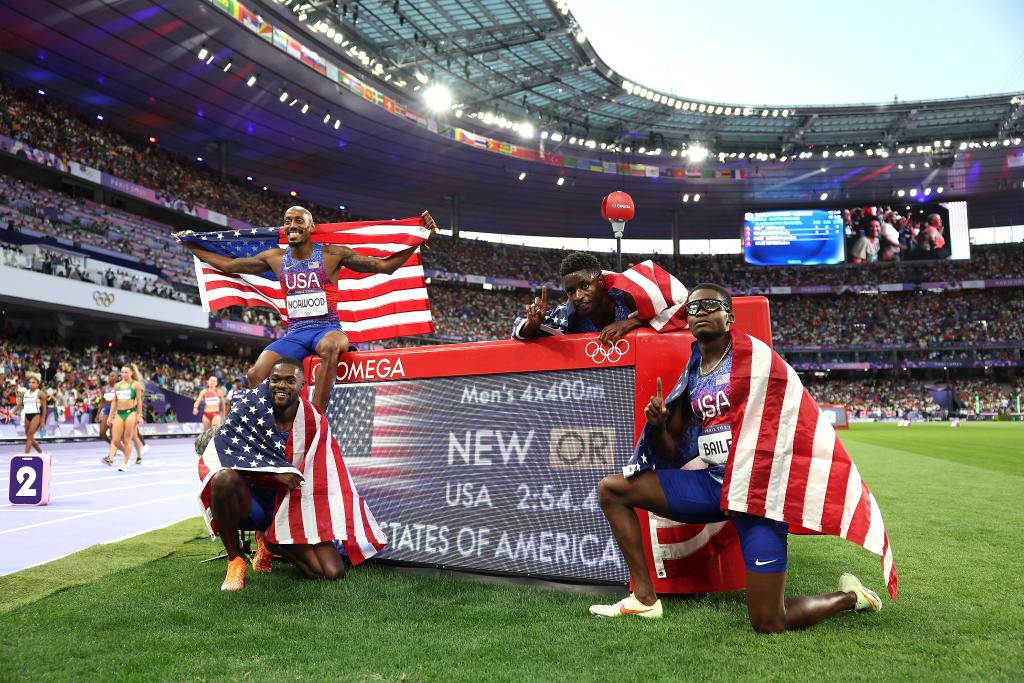 同样打破奥运纪录的还有美国男子4X400米接力队,此前的纪录由美国队在北京奥运会时创下,成绩是2分55秒39。比赛中,美国队最后一棒本杰明面对200米金牌获得者特博戈的迫近,守住了领先位置,以2分54秒43率先冲过终点。博茨瓦纳队以0.1秒之差获亚军。美国队距离2分54秒29的世界纪录也只差一点。