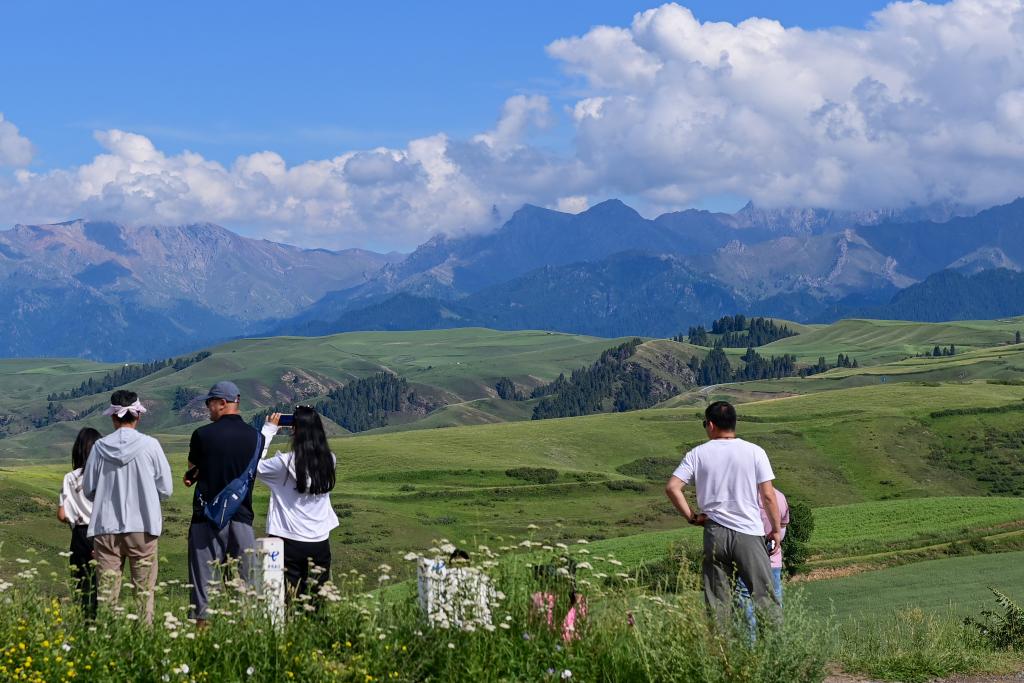 7月10日,在新疆昌吉回族自治州奇台县江布拉克景区,游客在拍摄万亩小麦旱田景观。新华社记者 丁磊 摄
