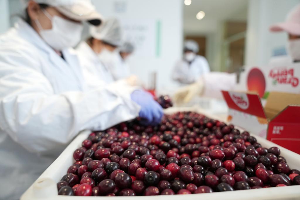 1月29日,在黑龙江省抚远市蔓越梅种植基地,工作人员分拣蔓越莓鲜果。新华社记者 王建威 摄