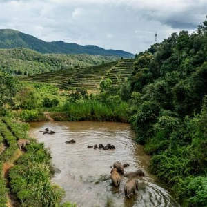 8月7日傍晚,在森林中吃饱喝足的象群穿越一片茶地,直奔一个大水塘。小象率先滑进水塘里,在水里翻滚嬉戏,接着几头母象依次下水洗澡,确定安全后,几头负责警戒的公象最后进入水塘里……