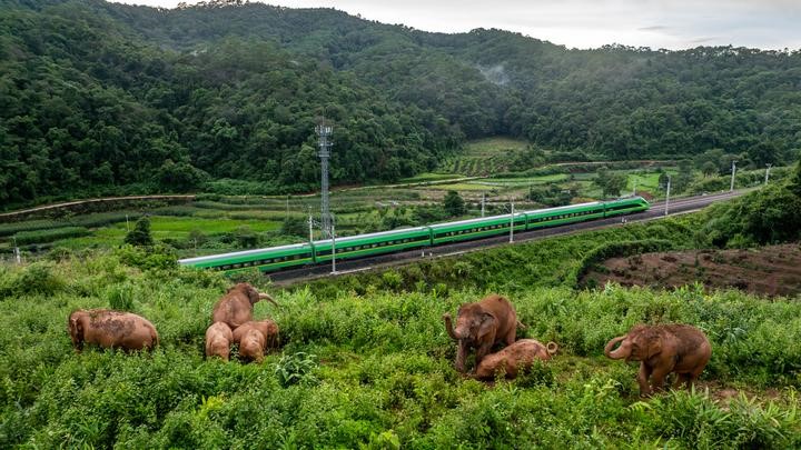 8月8日,“然然家族”和“短鼻家族”象群在景洪市大渡岗乡活动时,一辆复兴号列车从山脚下的中老铁路上驶过(无人机照片)。新华社记者胡超 摄