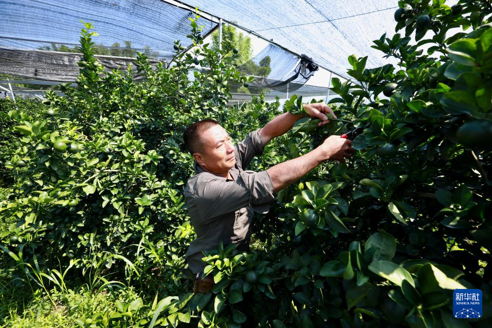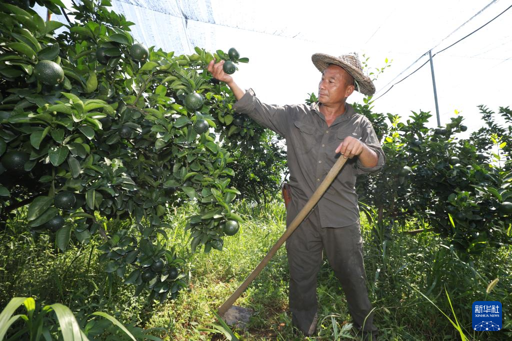 8月12日,福建南平市延平区炉下镇斜溪村村民王崇年在护理果园。 新华社记者 姜克红 摄