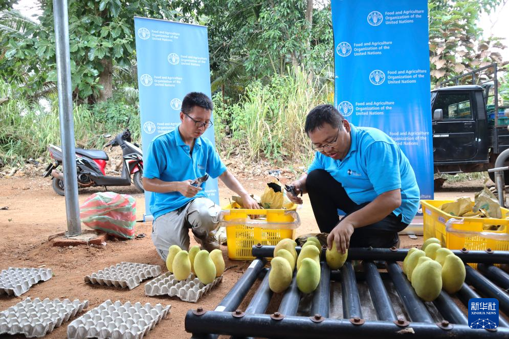 8月8日,中国热带农业专家在斯里兰卡阿努拉达普拉市的芒果示范基地检查收获的芒果。新华社发(中国、联合国粮农组织与斯里兰卡南南合作项目专家组供图)