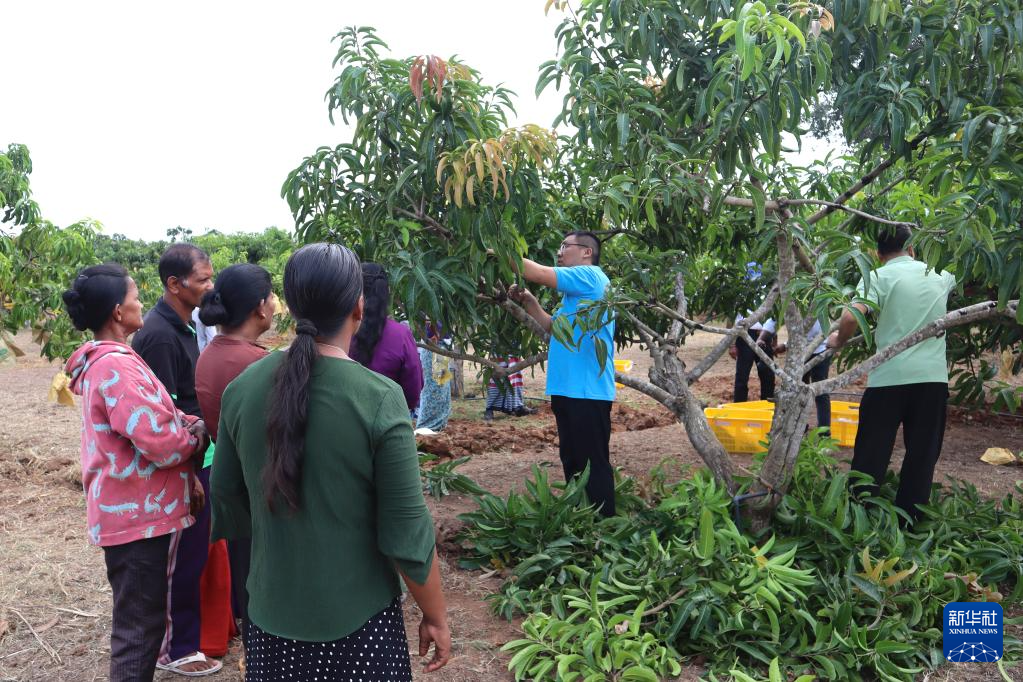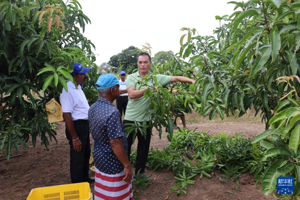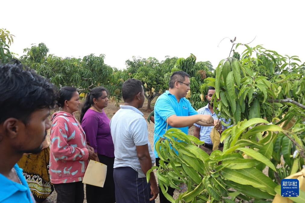 8月8日,中国热带农业专家在斯里兰卡阿努拉达普拉市的芒果示范基地对当地农户进行农业技术指导。新华社发(中国、联合国粮农组织与斯里兰卡南南合作项目专家组供图)