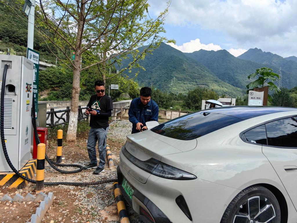 游客在汉中市留坝县玉皇庙镇下西河村的充电站为电动车充电。新华社记者 张斌 摄