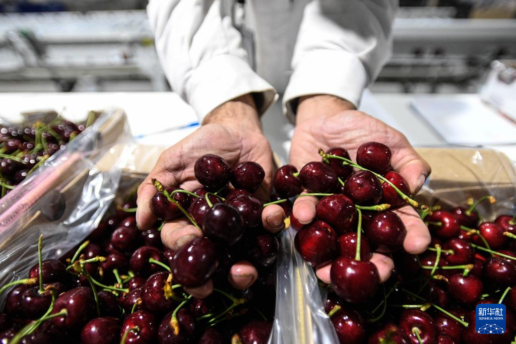 1月4日,工人在智利拉斯卡夫拉斯市的水果包装厂内展示车厘子。新华社发(豪尔赫·比列加斯摄)