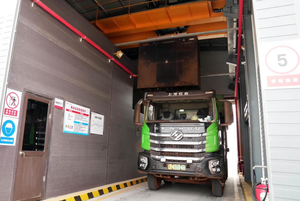 6月9日,一辆电动重卡在河北省沧州市境内的石黄高速黄骅服务区换电站更换电池。新华社记者 杨世尧 摄