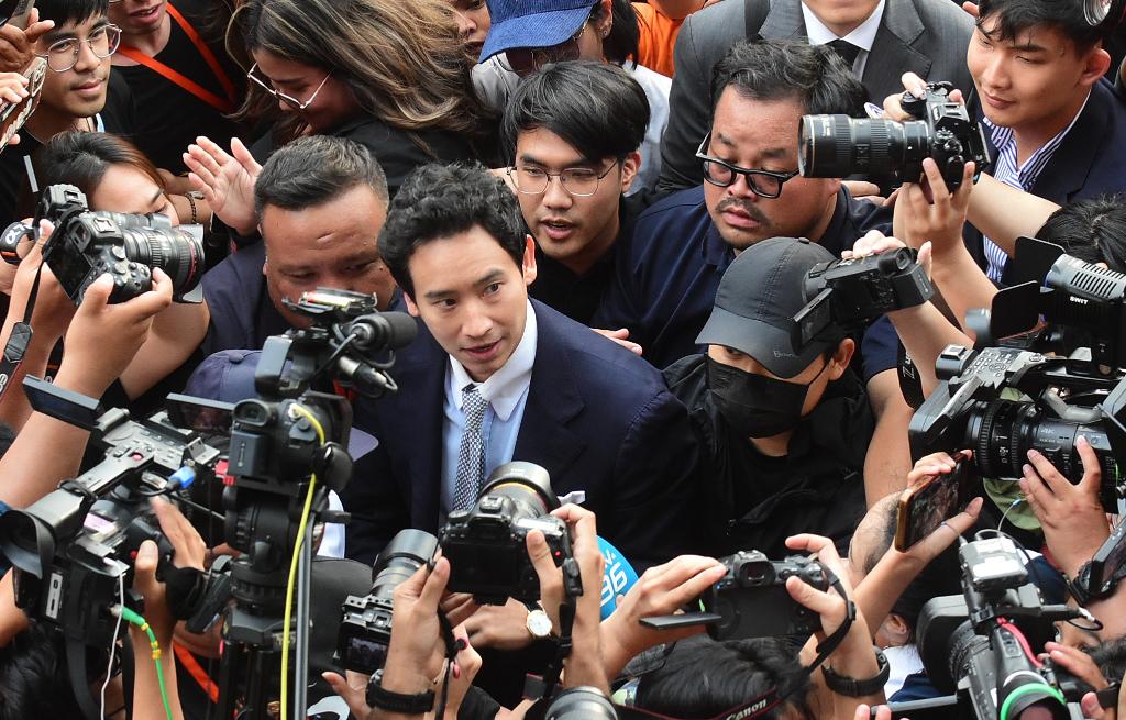 8月7日,在泰国曼谷,远进党前任党魁披塔·林乍伦拉(中)在泰国宪法法院裁定解散远进党后抵达远进党总部。新华社发(拉亨摄)