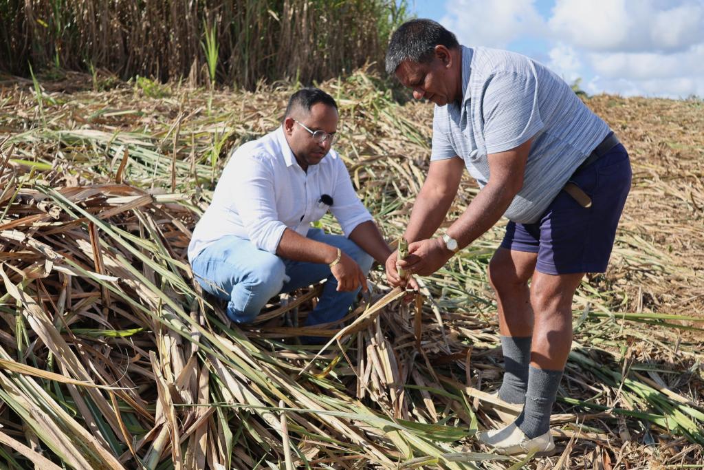 7月24日,在毛里求斯东部弗拉克区,冈尼斯·布鲁思(左)与父亲在自家的甘蔗地里劳作。新华社记者凌馨摄