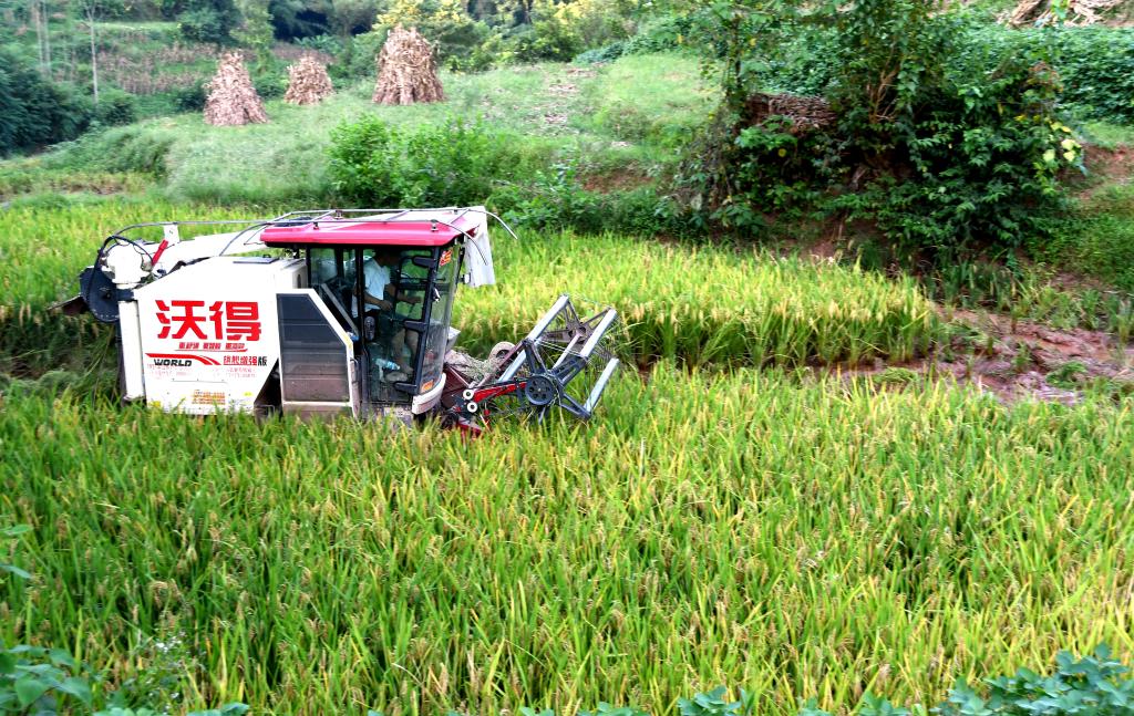 2024年8月7日,在宜宾市江安县夕佳山镇,一台收割机正在农田里收割水稻。新华社记者高健钧 摄