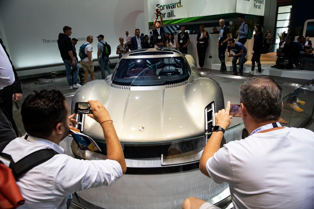 2023年9月5日,在德国慕尼黑,人们在德国国际汽车及智慧出行博览会上拍摄一款保时捷展车。新华社记者张帆摄