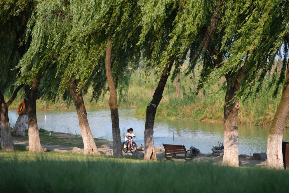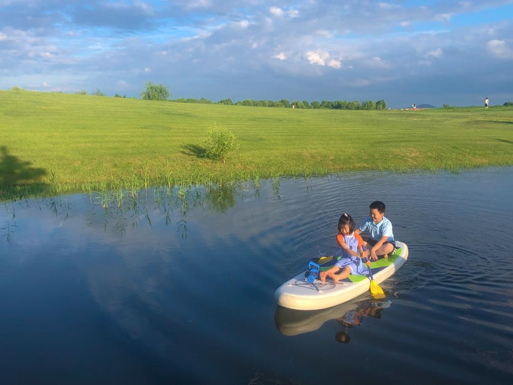 6月17日,小朋友在巢湖湖滨国家湿地公园骑行。
