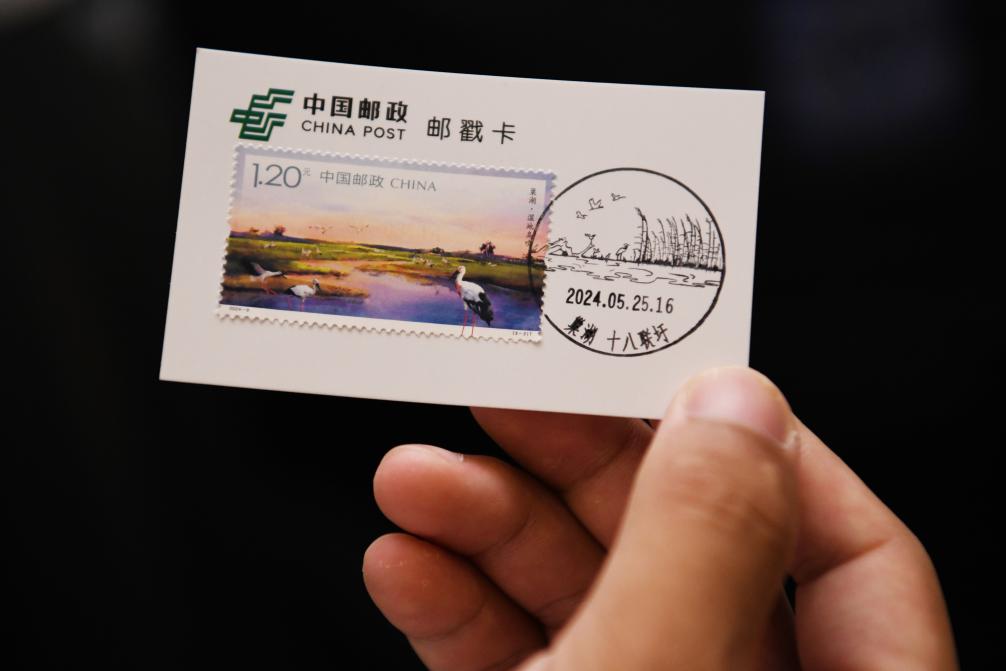 5月25日,在位于安徽省合肥市的合肥大剧院,市民展示购买的《巢湖》特种邮票。