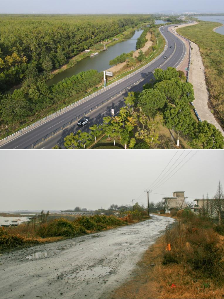 这是一张拼版照片:上图为2022年9月6日拍摄的巢湖岸线景象(新华社记者 张端 摄);下图为2007年拍摄的巢湖岸线景象(资料照片)。