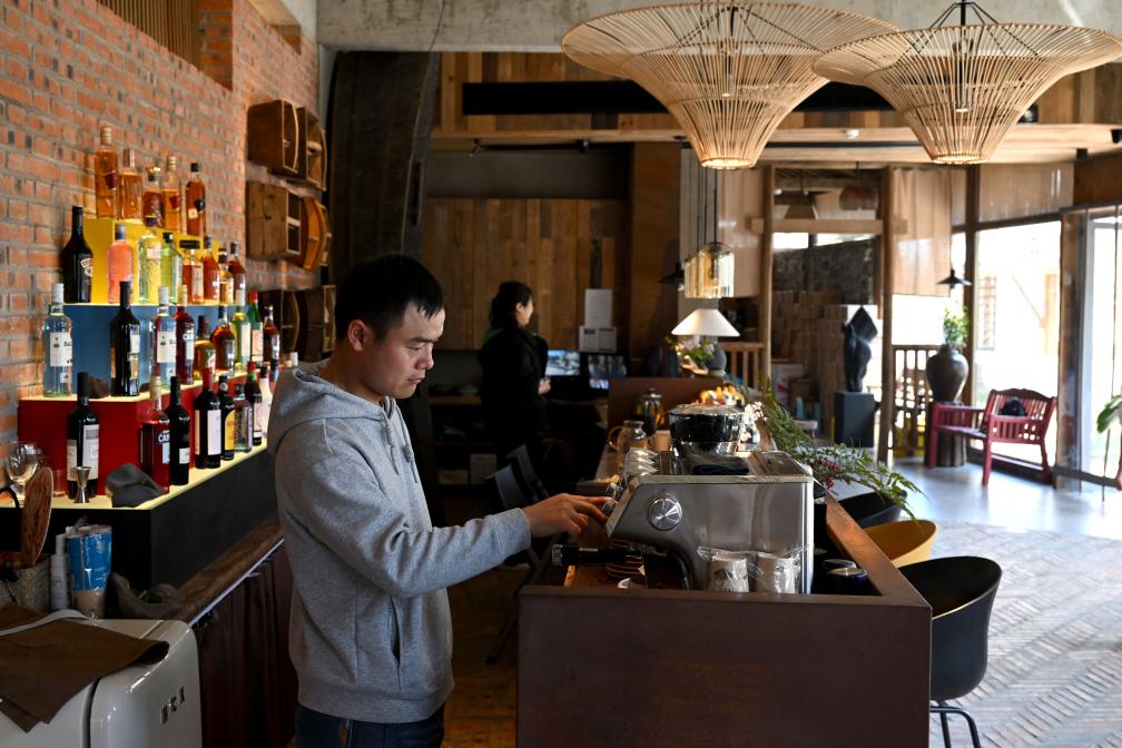3月30日,在巢湖之畔的花田·时光里民宿,民宿管家温纪高(前)为游客冲调咖啡。新华社记者 黄博涵 摄