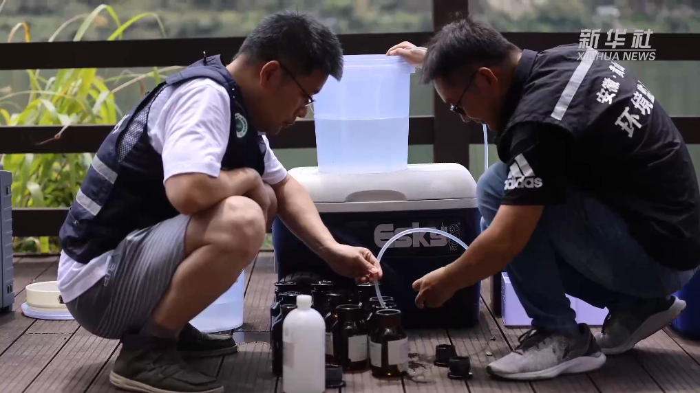 全国生态日来临之际,在安徽省黄山市歙县街口镇,来自安徽省黄山生态环境监测中心和浙江省杭州生态环境监测中心的工作人员在新安江流域跨省界断面采集联测水样,实时监测水质动态。