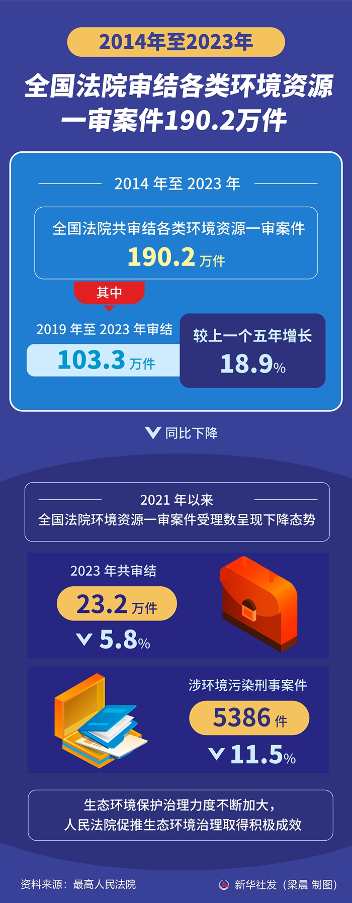 据介绍,人民法院充分发挥环境资源审判职能,依法公正高效审理各类环境资源案件。数据显示,2021年以来全国法院环境资源一审案件受理数呈现下降态势。2023年共审结23.2万件,同比下降5.8%;涉环境污染刑事案件5386件,同比下降11.5%。生态环境保护治理力度不断加大,人民法院促推生态环境治理取得积极成效。