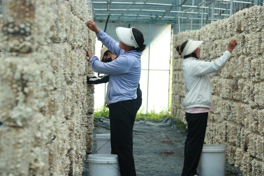 尼傲乡黑木耳种植基地内的工人正在工作。新华社记者李梓潇 摄