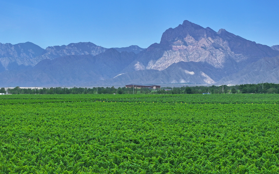 位于宁夏贺兰山东麓的酿酒葡萄种植基地(2024年6月12日摄,无人机照片)。新华社记者 王鹏 摄