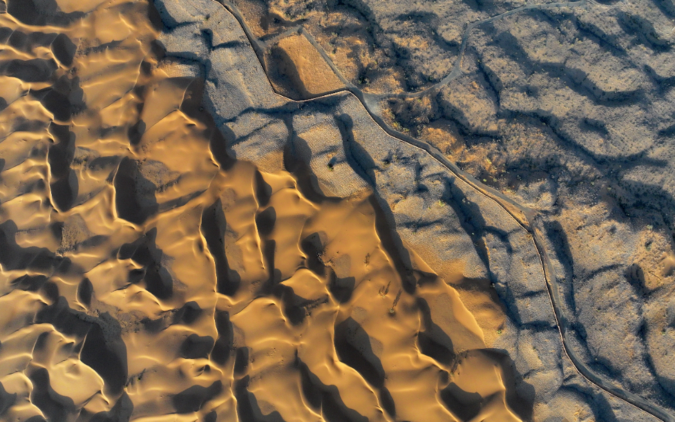 位于宁夏中卫市沙坡头腾格里沙漠边缘的治沙林带与沙漠交汇处(2023年9月6日摄,无人机照片)。新华社记者 王鹏 摄