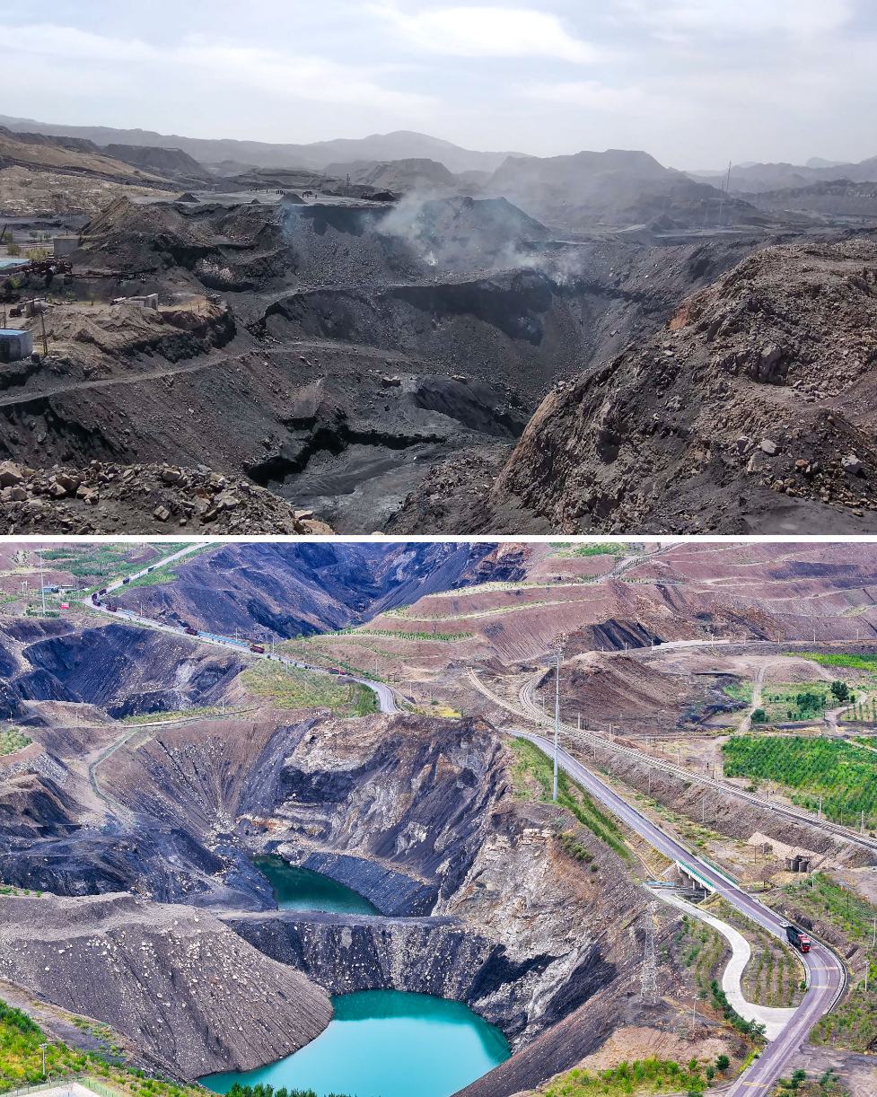 拼版照片,上图为:位于宁夏石嘴山市的贺兰山石炭井矿区(2017年5月30日摄,新华社发);下图为:2024年8月6日拍摄的修复治理后的贺兰山石炭井矿区(无人机照片,新华社记者冯开华摄)。新华社发