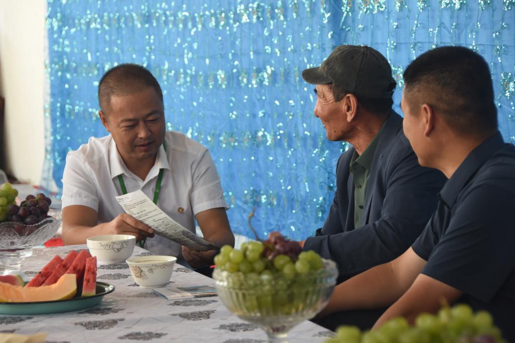 林草部门、保险企业工作人员上门为牧民讲解保险政策。 新华社记者 张晓龙 摄