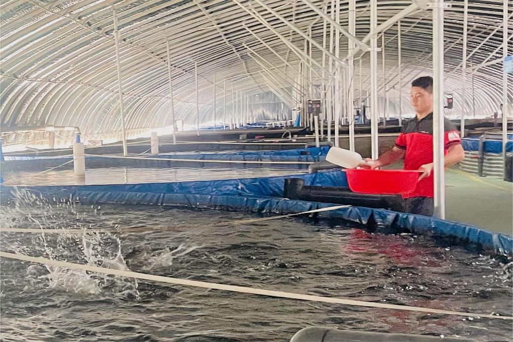 工作人员在养鱼设施内投撒饵料。新华社记者宋立崑 摄