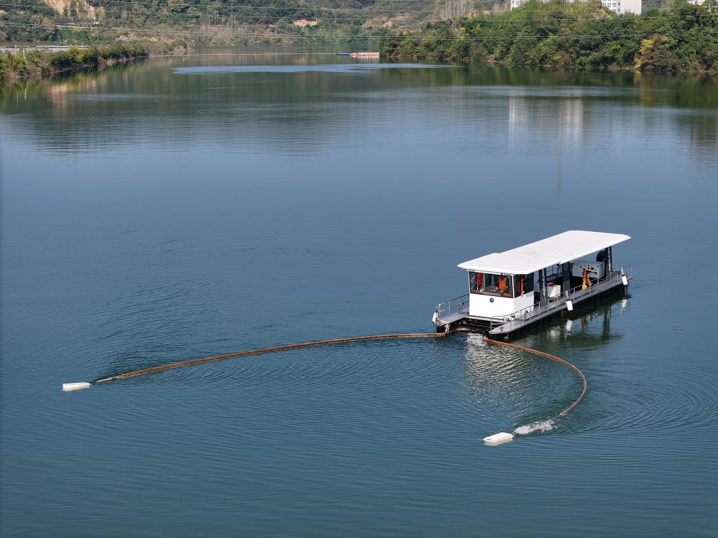 初秋,丹江口水库巍峨的大坝,清澈见底的湖水,郁郁葱葱的青山,构成一幅美丽画卷。记者从湖北省十堰市丹江口市关门岩村码头登上一艘清漂船,随清漂员张绪春一起巡检丹江口水库。张绪春不时用工具捞起水面枯枝。