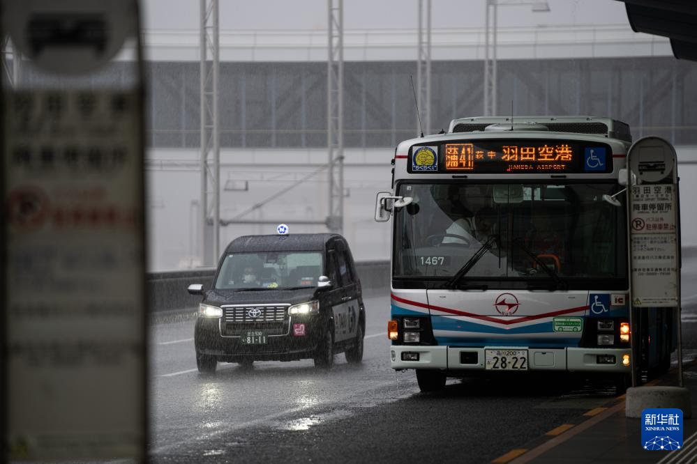 8月16日,在日本东京羽田机场,车辆行驶在暴雨中。新华社记者 张笑宇 摄