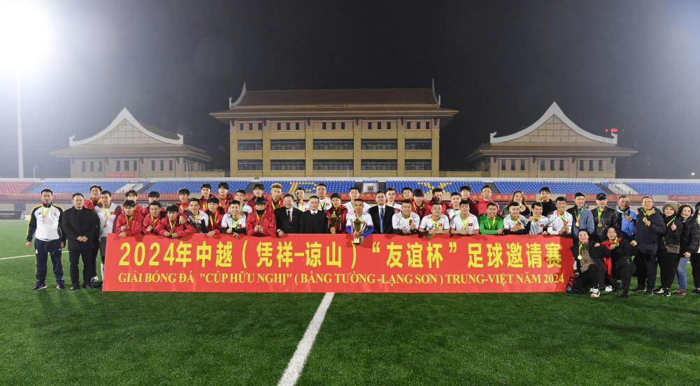2024年中越(凭祥-谅山)“友谊杯”足球邀请赛,赛后双方队员合影。(庞立坚 摄)