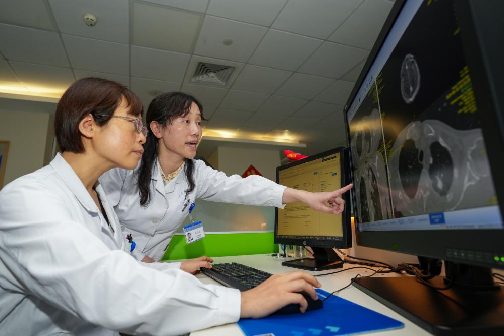 在江苏省人民医院,放射科主任吴飞云(右)和同事进行医学影像分析,并将影像及诊断结论上传至江苏省卫生健康云影像平台,供患者就医时使用。新华社记者李博 摄