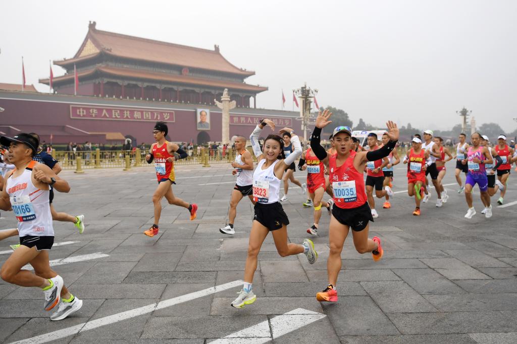 2023北京马拉松参赛选手奔跑在长安街上↑