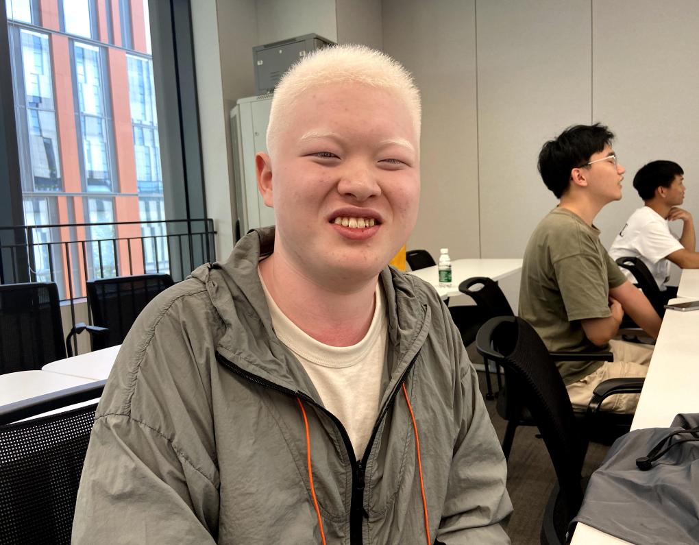 14日,在清华大学2024级本科新生报到新闻发布会上,此前被媒体报道的“用望远镜看黑板”的男孩张艺瑄充满自信地跟在场师生和媒体介绍着自己。患有先天性白化病的他,因视力严重损伤,说话时不断眯眼、闭眼,但仍乐呵呵地回答大家提出的问题。