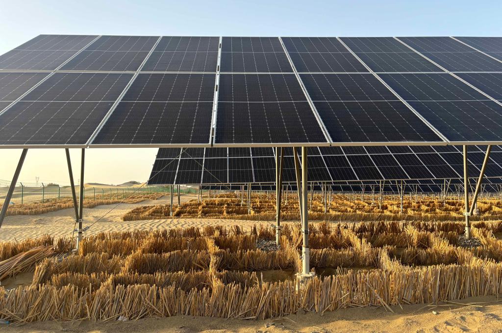 沙戈荒光伏生态治沙示范项目区。新华社记者杜刚 摄