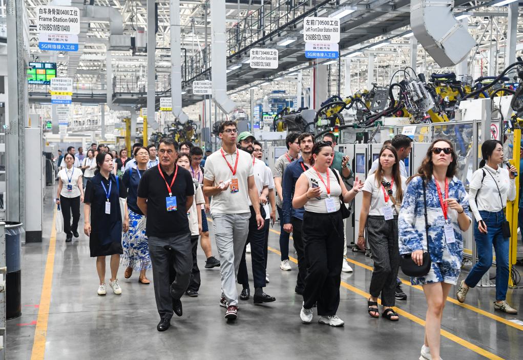 8月14日,2024“未来之桥”中国—中东欧青年研修交流营成员在赛力斯汽车凤凰智慧工厂参观新能源汽车生产线。新华社记者 王全超 摄