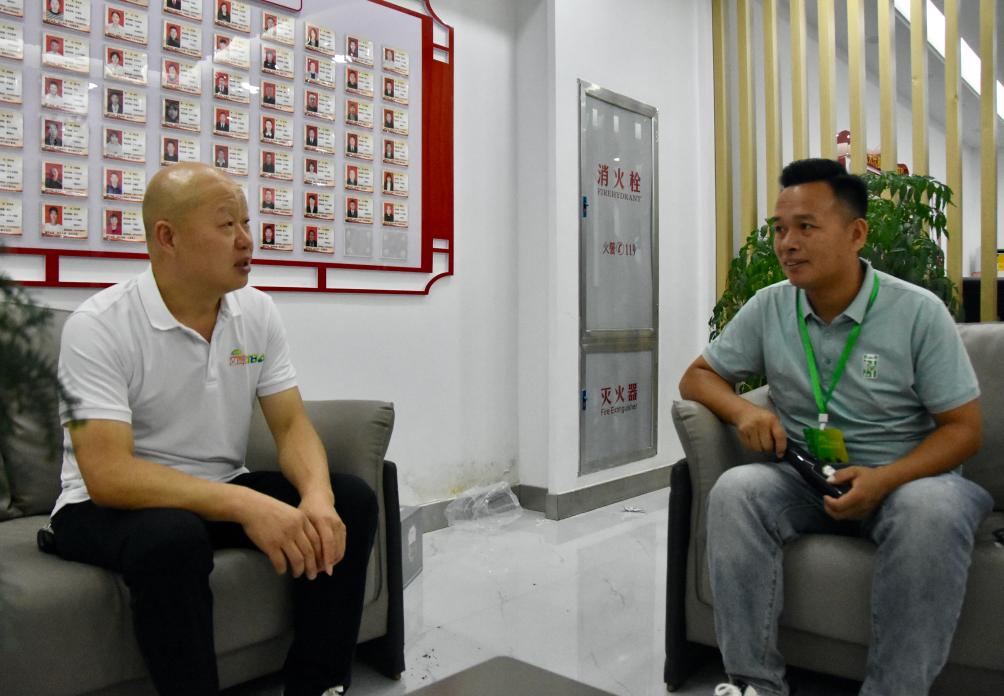 贾永建(左)正在和岑江龙进行交流。新华社记者 郑昕 摄