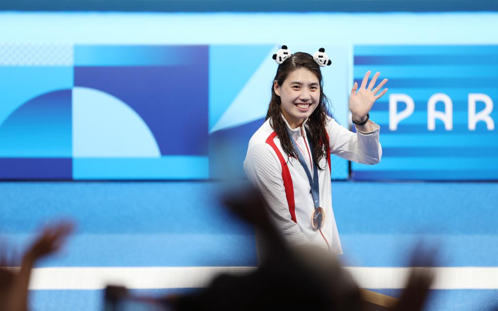 ↑巴黎奥运会女子50米自由泳季军中国选手张雨霏在颁奖仪式后