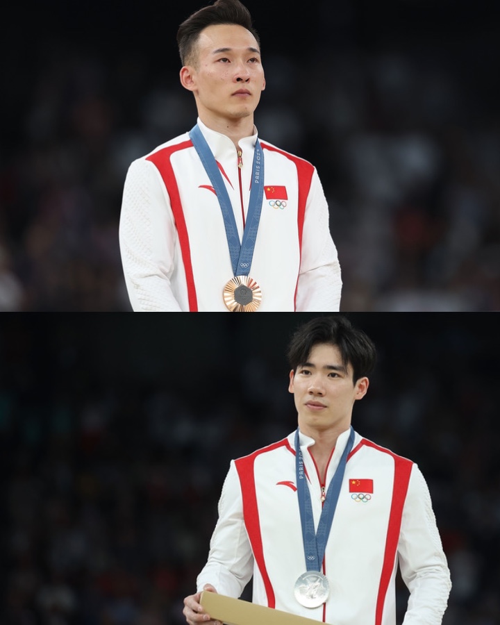 ↑肖若腾(上)和张博恒在巴黎奥运会体操男子全能颁奖仪式上
