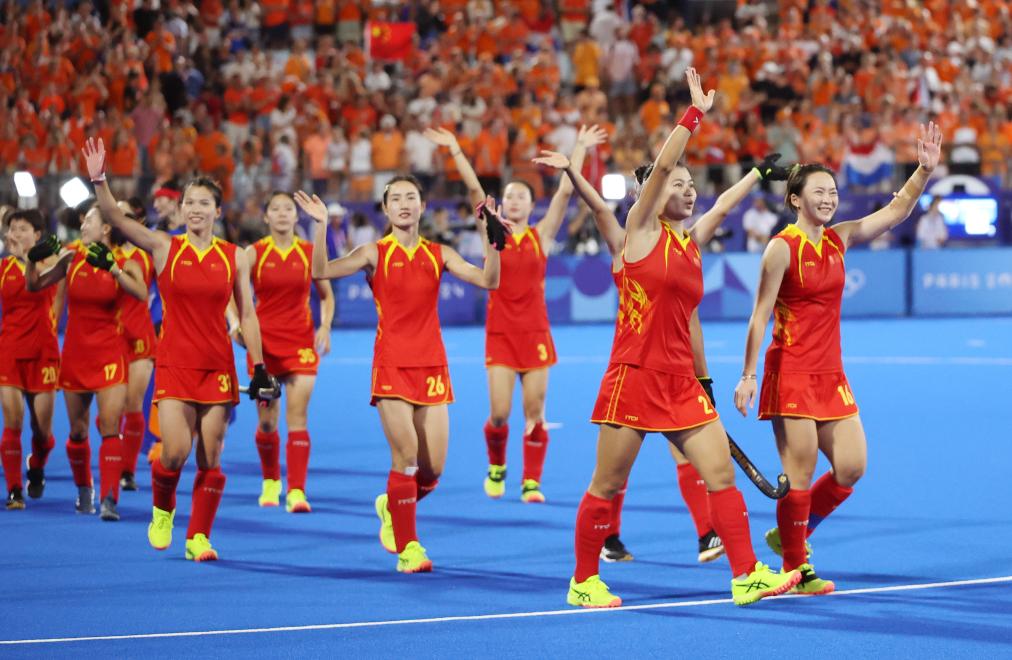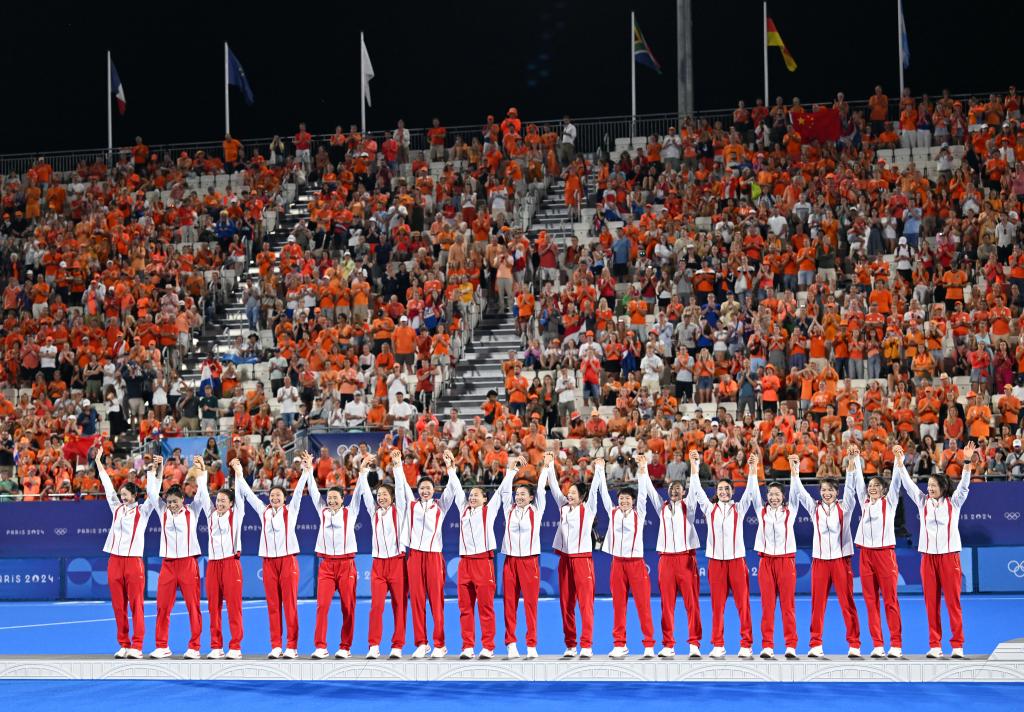↑巴黎奥运会女子曲棍球银牌得主中国队运动员在颁奖仪式上
