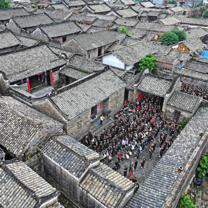 8月16日,一名身着汉服的游客在大芦村古建筑群里跳舞(无人机照片)。